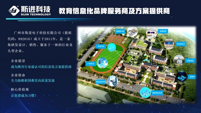 斯進科技創(chuàng)立至今,一直秉承“全力助推祖國教育高質量發(fā)展”的企業(yè)使命,始終堅持以“成為教育行業(yè)最認可的信息化方案提供商”作為企業(yè)愿景。目前,斯進科技已走進百萬教室、服務千萬師生,專注于為高職、普教、幼教及教培行業(yè)全學段提供先進、實用、全方位的教育化產(chǎn)品和解決方案及優(yōu)質的技術服務。