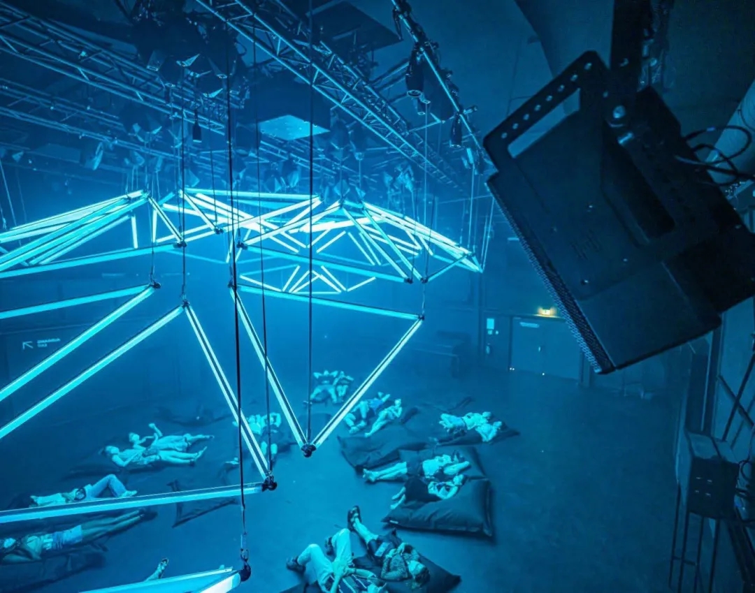 GRID,七個裝置中的主要裝置,結合了運動、光和電子音樂,為觀眾創(chuàng)造了一個巨大的視聽雕塑。