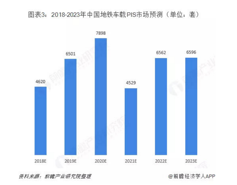據(jù)“十三五”規(guī)劃綱要的內(nèi)容,預(yù)計(jì)2020年城市軌道交通營(yíng)業(yè)里程將超過(guò)6600公里,新建里程達(dá)到3000公里,預(yù)計(jì)地鐵里程達(dá)到5318公里,按照我國(guó)城市軌道交通車輛保有量密度為11輛/公里來(lái)保守估計(jì),“十三五”期間我國(guó)城軌建設(shè)帶來(lái)的地鐵車輛需求增加3萬(wàn)輛,年均增加6000輛。而按照一輛車搭配一套車載PIS系統(tǒng)推測(cè),2018-2023年,地鐵PIS系統(tǒng)市場(chǎng)需求每年可保持在4500套以上;到2023年,地鐵PIS系統(tǒng)市場(chǎng)需求將達(dá)到6596套,