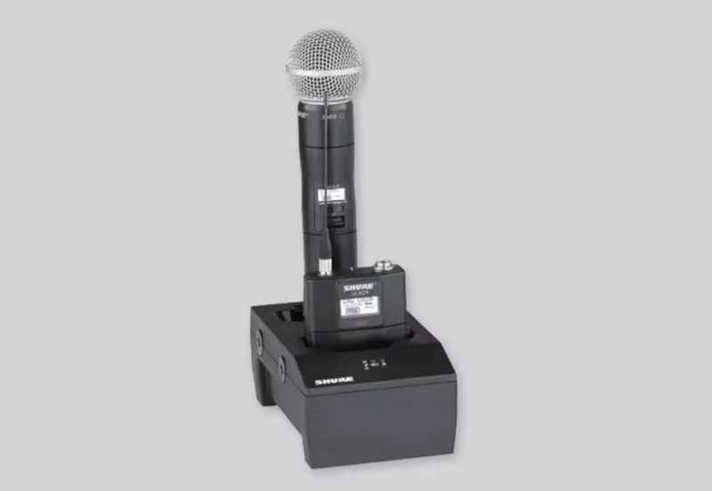 Shure ULX-D™發(fā)射機(jī)裝備鋰電池進(jìn)入SBC200充電器中充電,充電過(guò)程中自動(dòng)射頻信號(hào)啞音