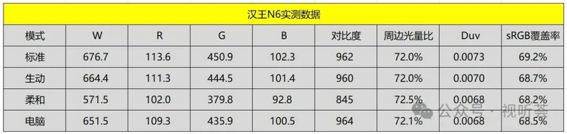 在標(biāo)準(zhǔn)模式下,漢王N6的亮度達(dá)到了676流明,而目前市面上2000元級(jí)別的智能微投,基本在500流明以下(智能微投領(lǐng)域虛標(biāo)較嚴(yán)重,我們以實(shí)際的亮度為準(zhǔn));測(cè)試出標(biāo)準(zhǔn)情況下對(duì)比度為962,色域達(dá)到了近70%,基本也是屬于中等偏上的水準(zhǔn)。(在柔和模式下,為了更加護(hù)眼,各項(xiàng)數(shù)值有所降低)