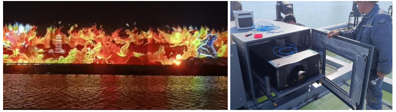 作為本次水幕秀投影系統(tǒng)的集成商,北京中清未來科技在Crimson WU32投影機的規(guī)劃、安裝和調試過程中發(fā)揮了關鍵作用。這些安裝在湖心浮排上的投影機面臨著大量水霧和濕氣的挑戰(zhàn)。為此,項目團隊為其定制了配備恒溫與冷卻系統(tǒng)的防水外殼,有效調節(jié)內部溫濕度,使其免受環(huán)境侵蝕,確保在各種天氣條件下穩(wěn)定運行。