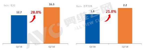 銷售額29億元,同比增長70.5%;銷售面積實(shí)現(xiàn)51.9%的同比增長,達(dá)4萬平方米。 2018年H1中國小間距LED國內(nèi)市場銷售額和銷售面積及其環(huán)比 數(shù)據(jù)來源:奧維云網(wǎng)(AVC)顯示器件與系統(tǒng)大數(shù)據(jù),單位:億元